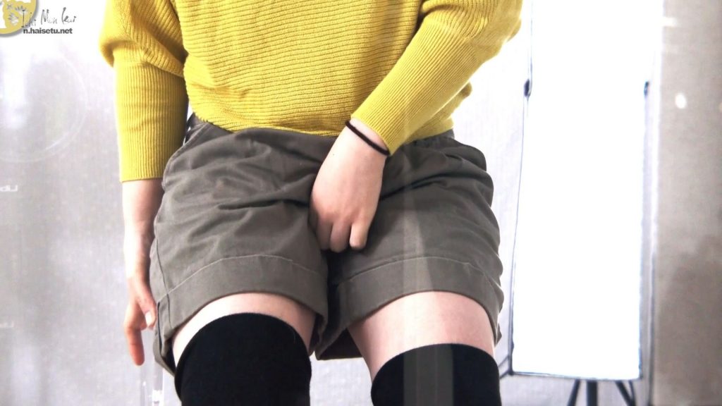 そのまま立ち上がると、お股を握った手を前後に動かしてスリスリ。呼吸もどんどん荒くなり、見方によっては変わった自慰行為のようにも見えます。股間を慰め、脚をクロスし「フーッ!フーッ!ウゥゥゥゥゥ~~~~~」と獣のようなうなり声をあげて我慢していたお嬢さんでしたが、遂にその時が……