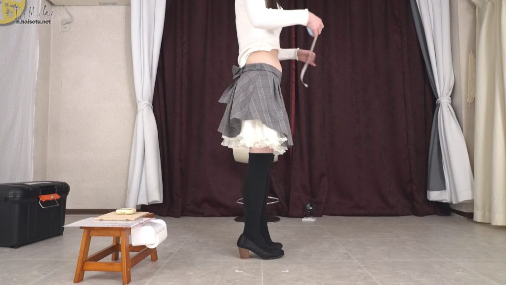 スタッフ尿漏が説明する中、へっぴり腰の姿勢でぎこちなく尿意を我慢するりえさん。