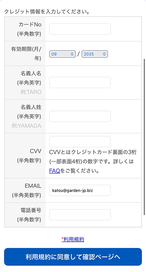 決済画面では、必ず一門会にご登録のe-mailアドレスと同じe-mailアドレスをご入力ください。同じアドレスでない場合、自動でポイントが追加されません。