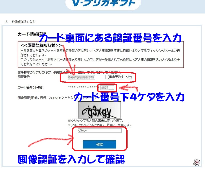 認証番号とカード番号の下4ケタ、画像認証をそれぞれ入力して確認