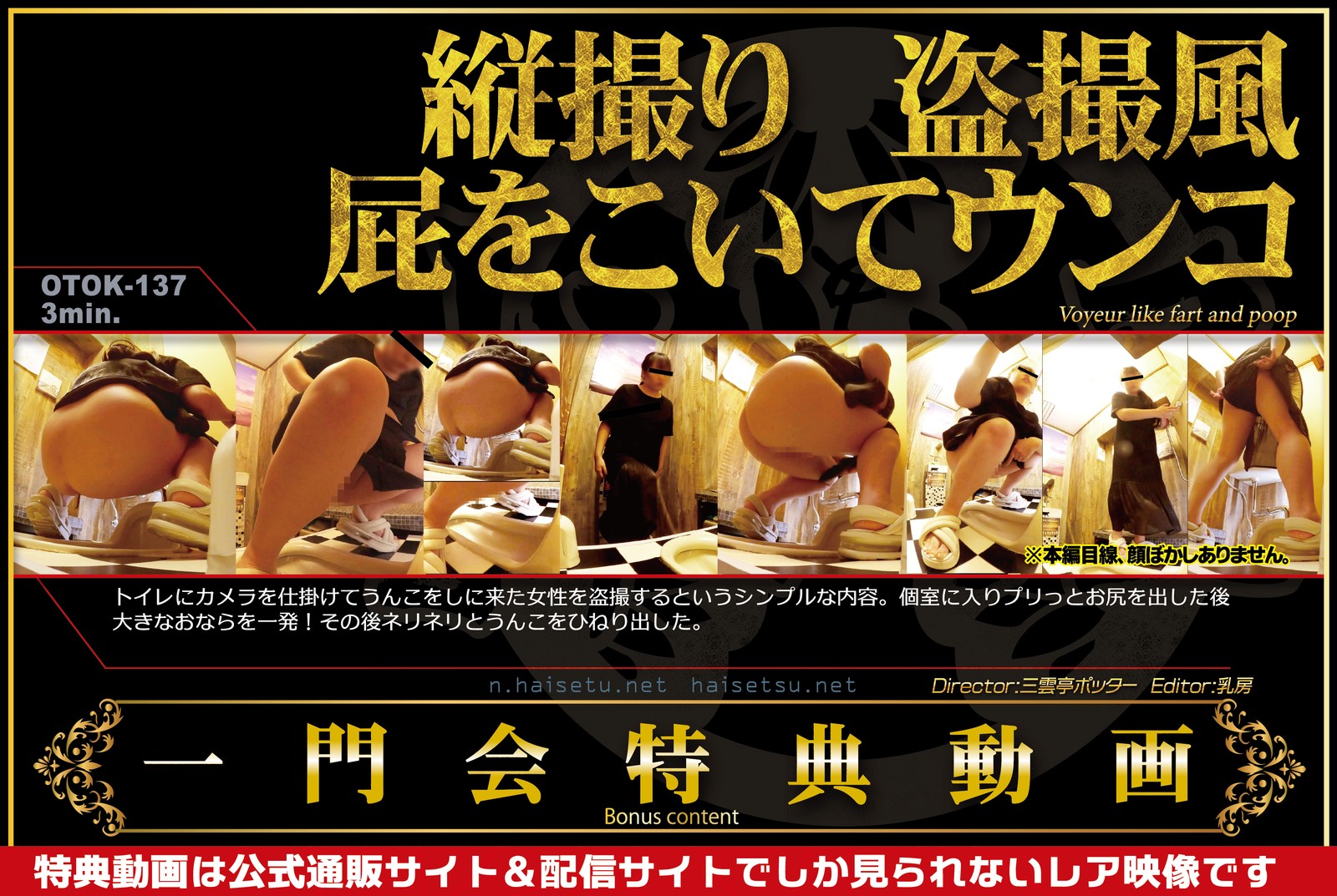 ※その月の始めのご注文時、3000円以上お買い求めの場合に限り、OTOK品番の作品を1枚プレゼント致します。特にご希望が無い限り、最新作をお送りいたします。今月は「OTOK-137 縦撮り 盗撮風屁をこいてウンコ」の予定です。